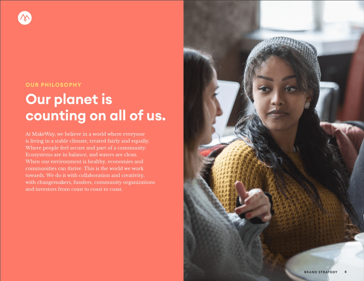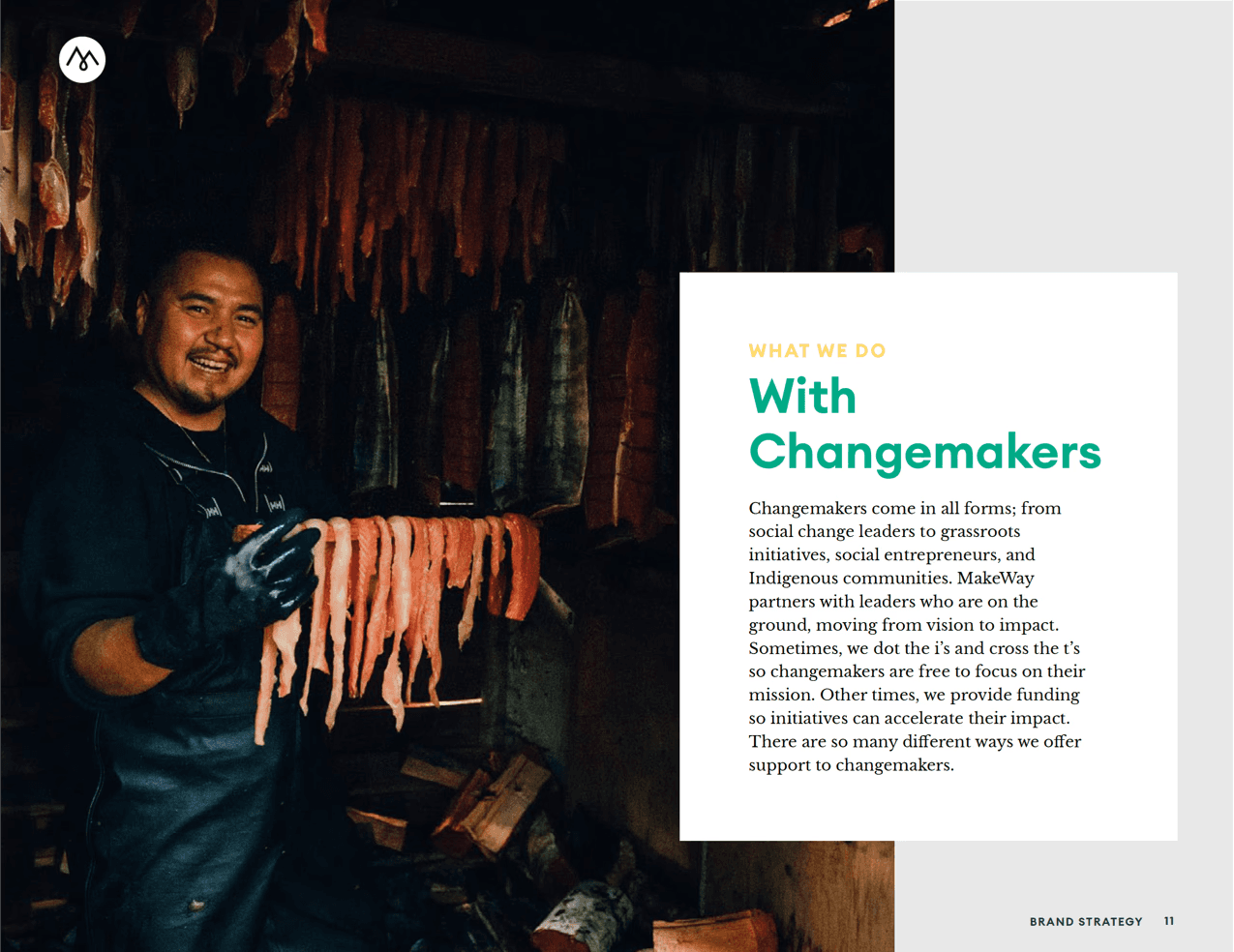 Not a typical charity, we needed to build a brand identity that embodied its purpose but also helped to explain the unique model at the same time. MakeWay became not just a name but a call to action. The identity reflected the momentum and energy of the brand yet maintained the human connection and gravitas that aligns with the change-making work they do. The identity provided the foundation for the video, marketing materials, and website.
